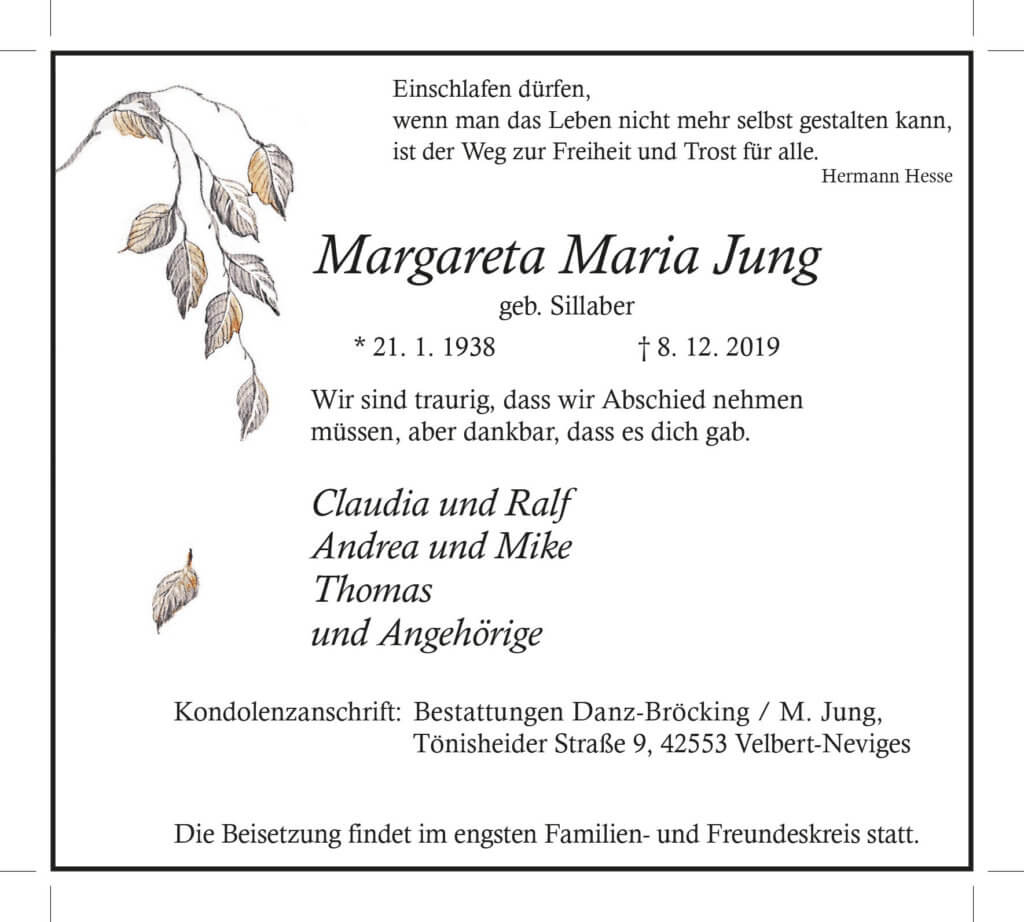 Margareta Maria Jung † 8. 12. 2019