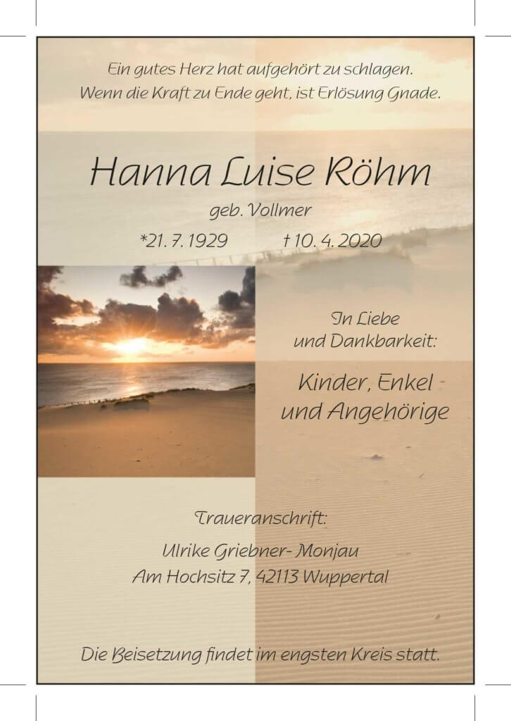 Hanna Luise Röhm † 10. 4. 2020