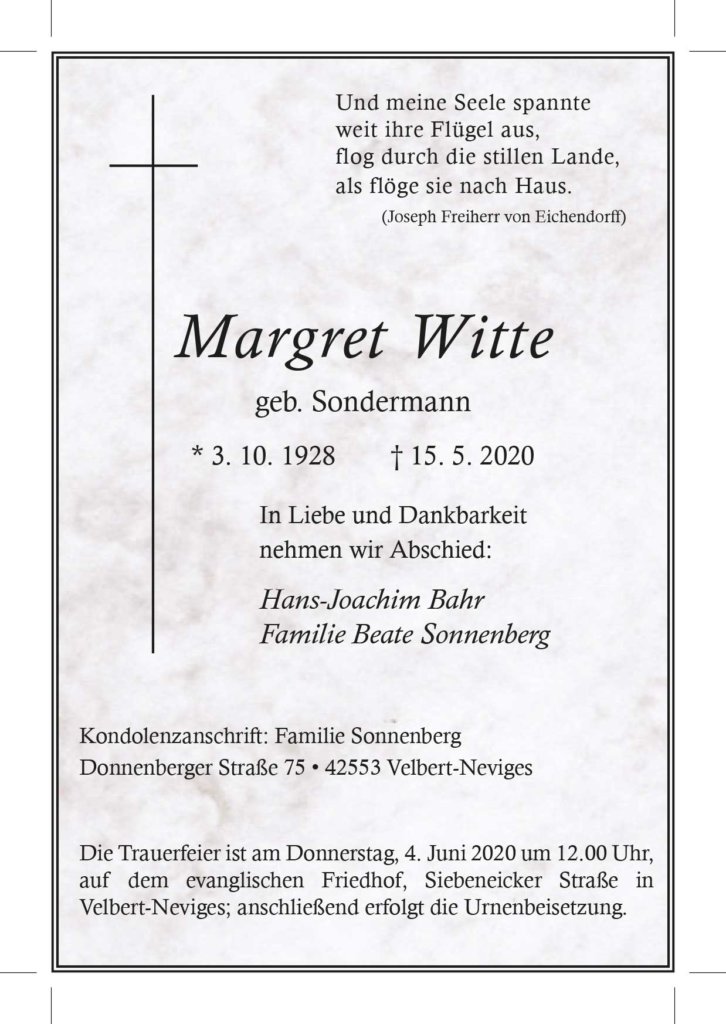 Margret Witte † 15. 5. 2020