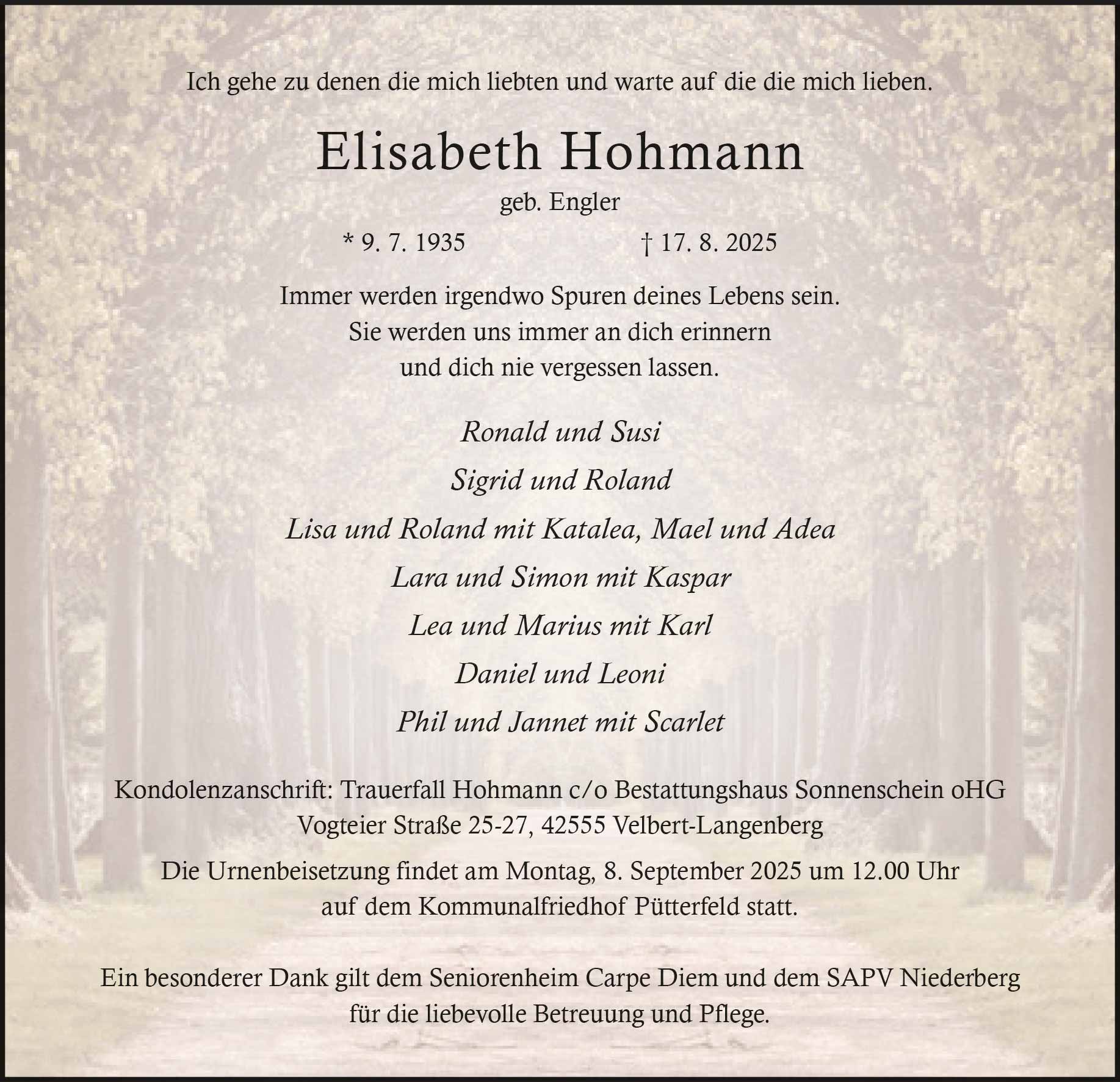Elisabeth Hohmann † 17. 8. 2025
