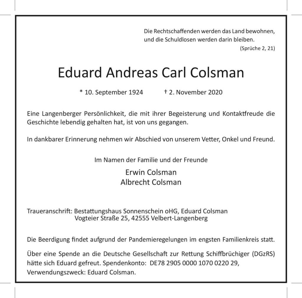 Eduard Andreas Carl Colsman † 2. 11. 2020